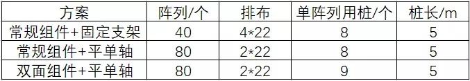 注:考慮遮擋、設(shè)備運行等因素,雙面+平單軸方案要比常規(guī)組件方案單陣列用樁量多。
