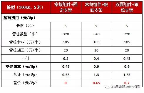 由上表可知,與“常規(guī)組件+固定支架”方案相比,“雙面組件+平單軸”方案的支架和基礎(chǔ)成本增加了0.7元/Wp,“常規(guī)組件+平單軸”方案增加了0.65元/Wp。