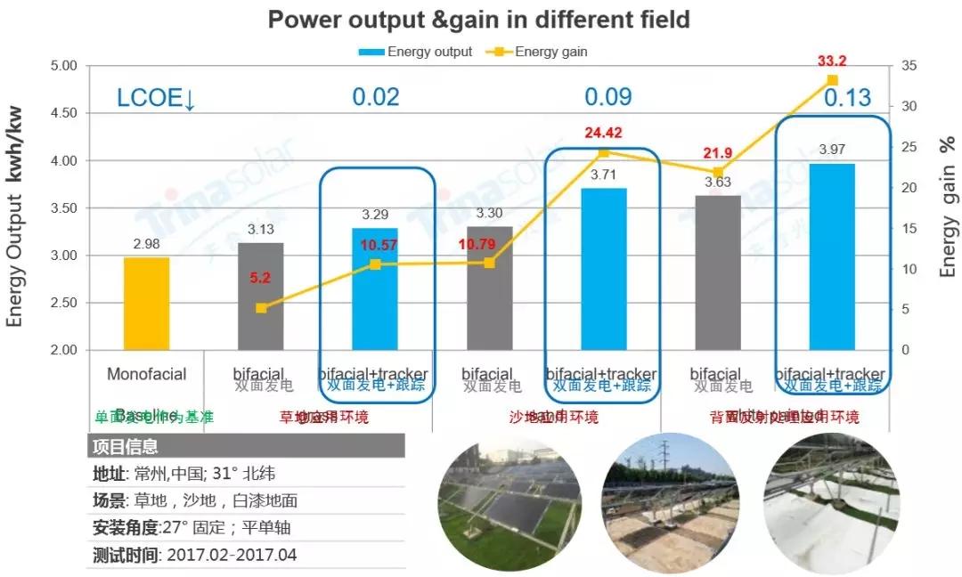 此外,通過一些項目案例數(shù)據(jù)也可以看出,雙面組件+跟蹤系統(tǒng)的發(fā)電量提升能帶來1+1>2的效果,有效降低度電成本。如天合光能在常州的一組戶外實證數(shù)據(jù)顯示,相對常規(guī)單面組件而言,“雙面+跟蹤”的方案在草地、沙地和白板地面反射條件下,發(fā)電量增益分別可達10.57%、24.42%、33.2%,度電成本可分別下降0.02元、0.09元和0.13元。