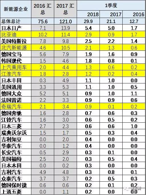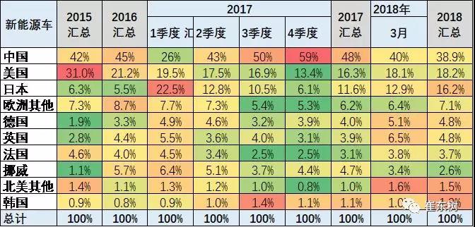 中國新能源車在世界市場的表現不斷的提升之中,16年在世界市場份額達到45%,17年中國的份額上升到47%,其中17年四季度達到59%的單位,18年1-3月份,中國新能源車占世界市場的份額達到37%,相比較17年1-3月份的21%,大幅提升了16個百分點。至于其他國家的形成和基本都處于下降之中,尤其是日本,從17年1到2分的24%下降到今年的21%,日本的新能源車新車優(yōu)勢,暫時放緩。