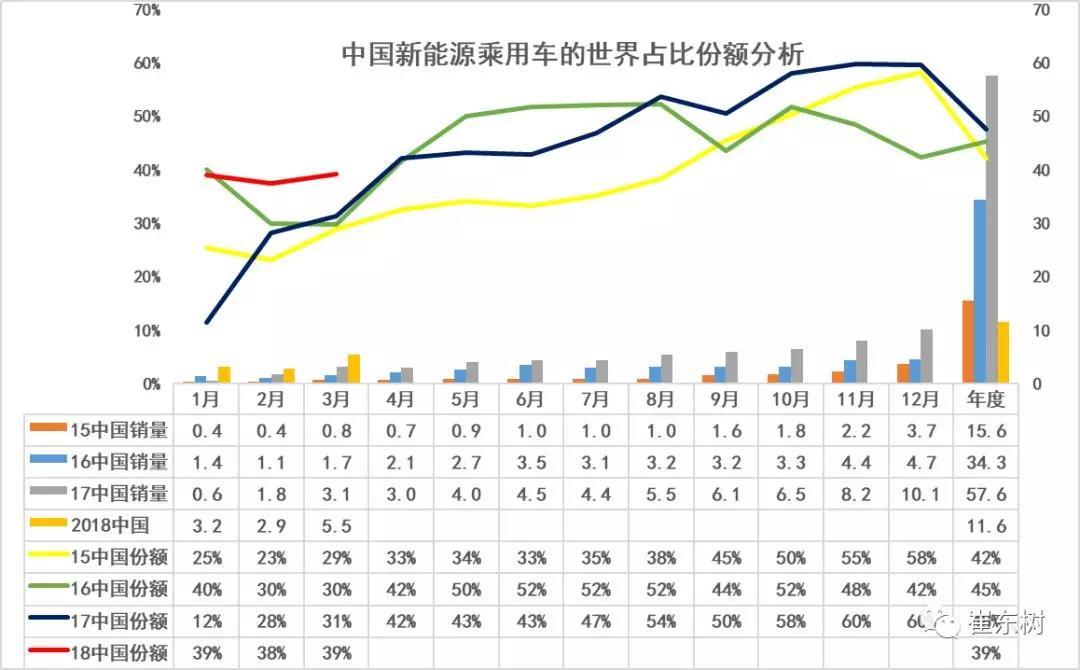 2018年一季度中國新能源乘用車的世界份額達到39%,,前三個月的份額基本保持在39%不變。這16年,中國新能源車在世界份額達到45%,17年達到48%,但是其中特征都是前低后高,的走勢,3月份的新車份額總體是中國相對較低的,2018年的份額在年初表現就特別突出,未來仍有增長潛力,,