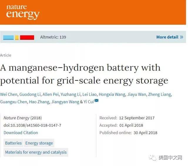 4月30日,在《自然》雜志旗下的《自然-能源》上刊發(fā)的一篇學術(shù)文章,引起全球能源界巨大關(guān)注。來自斯坦福大學的一項最新研究成果為大規(guī)模儲能帶來新希望。該校材料系著名華裔教授崔屹實驗組發(fā)明的新型水電池——錳氫氣電池(Mn-H)——可循環(huán)使用超過1萬次!其低成本、長壽命、高能量密度的潛在性能將有望在大規(guī)模儲能領(lǐng)域帶來巨大變革。
