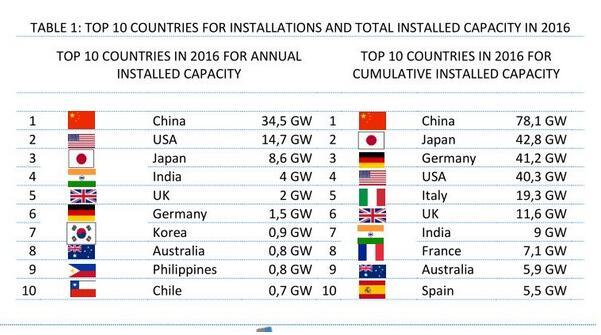 對(duì)比2016年全球新增裝機(jī)和累計(jì)裝機(jī)排名前10的國家(如下圖所示)可以看出,2017年,以中國、印度的亞洲市場新增裝機(jī)保持快速增長,并成為支撐全球光伏擴(kuò)張的重要力量,而以美國、德國為代表的歐美地區(qū)國家新增裝機(jī)則普遍出現(xiàn)增速放緩甚至負(fù)增長。此外,巴西、澳大利亞等新興市場開始嶄露頭角,增長勢頭較為明顯。