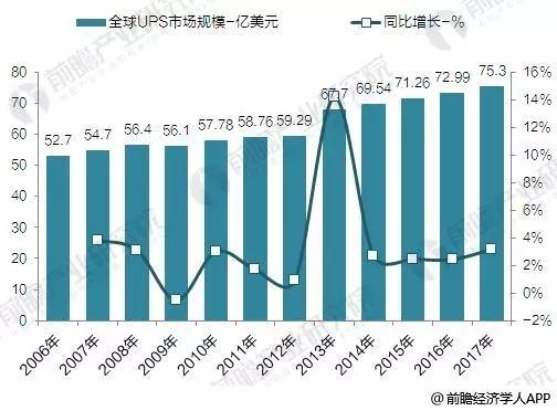 根據(jù)前瞻產(chǎn)業(yè)研究院發(fā)布的《2018-2023年中國不間斷電源(UPS)行業(yè)市場前瞻與投資戰(zhàn)略規(guī)劃分析報告》數(shù)據(jù)顯示,2006-2016年全球UPS市場銷售額逐年增長,但整體保持較低的增速,2013年全球UPS市場規(guī)模約為67.70億美元,同比增長14.18%,為從2006年以來歷年最高增速;2016年全球UPS市場規(guī)模約為72.99億美元,同比上漲2.43%。
