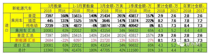 18年1-3月的新能源汽車的進出口表現(xiàn)分化。2018年1-3月份進口乘用車總量達到6397臺,同比增長達到13%,進口5.3億美元,較去年的增長27%。普混的進口15615輛,同比增長140%,均價達到每臺2.9萬美元。3月份,新能源汽車進口達到了2684臺,同比增長-22%,。