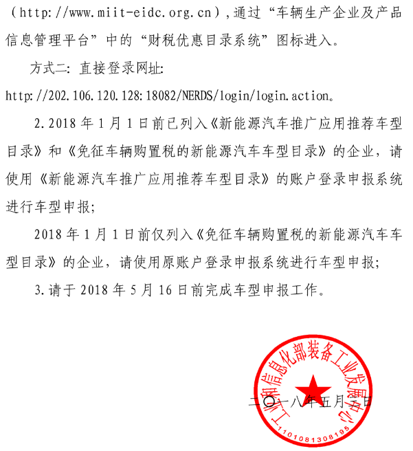 2018年1月1日前僅列入《免征車輛購(gòu)置稅的新能源汽車車型目錄》的企業(yè),使用原賬戶登錄申報(bào)系統(tǒng)進(jìn)行車型申報(bào)。