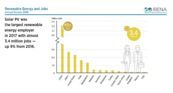 2017年,太陽(yáng)能光伏行業(yè)仍然是所有可再生能源技術(shù)的最大雇主,約占340萬(wàn)個(gè)就業(yè)崗位。2017年實(shí)現(xiàn)創(chuàng)紀(jì)錄的94吉瓦部署容量,增加近9%。中國(guó)約占2/3的光伏就業(yè)崗位,相當(dāng)于220萬(wàn)人,比上一年增長(zhǎng)了13%。