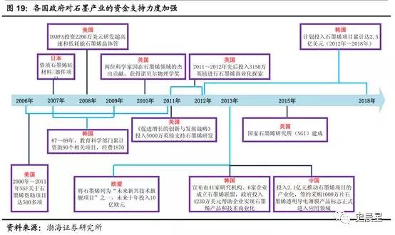 《中國制造 2025》明確了石墨烯發(fā)展目標(biāo),2020 年“規(guī)模制備及電化學(xué)儲(chǔ)能、印刷電子、航空航天用輕質(zhì)高強(qiáng)復(fù)合材料、海洋工程防腐等應(yīng)用領(lǐng)域的技術(shù)水平達(dá)國際領(lǐng)先,大幅提升相關(guān)產(chǎn)品性能,形成百億元產(chǎn)業(yè)規(guī)模,2025 年突破石墨烯在電子信息領(lǐng)域應(yīng)用的技術(shù)瓶頸,整體產(chǎn)業(yè)規(guī)模突破千億。