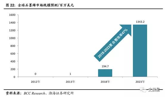 但石墨烯作為基礎(chǔ)材料,下游應(yīng)用領(lǐng)域極為廣闊,美國 BCC Research 預(yù)測(cè),2018 年全球石墨烯整體市場(chǎng)規(guī)模可能高達(dá) 1.95 億美元,2023年石墨烯應(yīng)用規(guī)模將達(dá)到 13.43 億美元,復(fù)合增長率 47%。