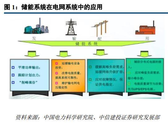 儲(chǔ)能在電力系統(tǒng)中應(yīng)用廣泛。 儲(chǔ)能泛指能量的存儲(chǔ),本報(bào)告中儲(chǔ)能特指電能的儲(chǔ)存。 在整個(gè)電力系統(tǒng)各個(gè)環(huán)節(jié),儲(chǔ)能都可以有其應(yīng)用, 包括:在發(fā)電側(cè),可以提高發(fā)電的穩(wěn)定性,提高電能質(zhì)量,從而促使可再生能源大規(guī)模并網(wǎng);在輸變電環(huán)節(jié),可以聯(lián)合電源降低輸變電的成本;在配送電環(huán)節(jié),可以緩解配電的初始投資以及電網(wǎng)的升級(jí)擴(kuò)容;在用戶側(cè),可以通過峰谷差套利,提高用戶的電能質(zhì)量,減少用戶的用電成本。