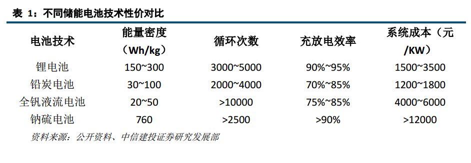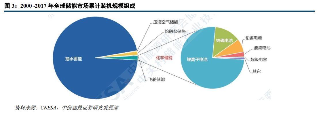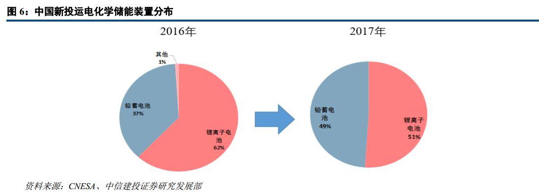 鋰電池和鉛蓄電池占據(jù)大部分電化學(xué)儲(chǔ)能市場(chǎng)。 電化學(xué)儲(chǔ)能載體是各種二次電池,主要包括鋰離子電池、鉛蓄電池、鈉硫電池和液流電池等。 從各種儲(chǔ)能電池性能比較來看,鋰電池與鉛蓄電池由于產(chǎn)業(yè)化基礎(chǔ)較好,相比其他路線具有明顯成本優(yōu)勢(shì),因此是目前電化學(xué)儲(chǔ)能的主要參與者。 從全球電化學(xué)儲(chǔ)能技術(shù)分布上來看,鋰離子電池功率規(guī)模最大, 2017 年新增投運(yùn)功率規(guī)模 846MW,在電化學(xué)儲(chǔ)能中占比超過 90%;而國(guó)內(nèi)份額則主要被鋰離子電池和鉛蓄電池占據(jù), 2016、 2017 年新增電化學(xué)儲(chǔ)能幾乎全部采用鋰離子電池和鉛蓄電池,其中2017 年兩者占比分別達(dá)到 51%、 49%。