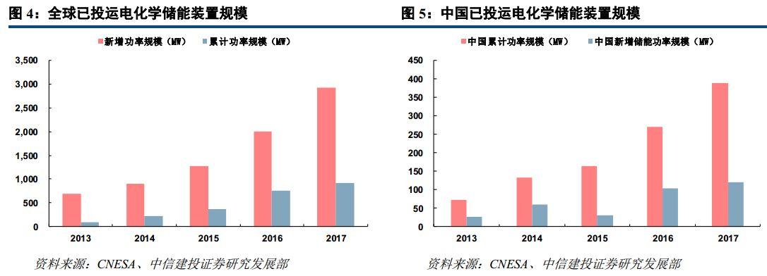 電化學(xué)儲(chǔ)能現(xiàn)總體規(guī)模占比較小,但近幾年發(fā)展迅猛。 根據(jù) CNESA 項(xiàng)目庫的不完全統(tǒng)計(jì),截止 2017 年底全球已投運(yùn)儲(chǔ)能項(xiàng)目累計(jì)裝機(jī)規(guī)模為 175.4GW,抽水儲(chǔ)能占比達(dá)到 96%,其次為電化學(xué)儲(chǔ)能,占比為 1.7%。雖然目前電化學(xué)儲(chǔ)能占比較小,但卻是發(fā)展速度最快的儲(chǔ)能技術(shù), 2012~2016 年全球電化學(xué)儲(chǔ)能累計(jì)裝機(jī)量復(fù)合增長(zhǎng)率達(dá)到 32%。截止 2017 年底全球已投運(yùn)電化學(xué)儲(chǔ)能項(xiàng)目累計(jì)功率規(guī)模為 2926.6MW, 新增規(guī)劃、在建的電化學(xué)儲(chǔ)能項(xiàng)目裝機(jī)規(guī)模為 3063.7MW;國(guó)內(nèi)已投運(yùn)電化學(xué)儲(chǔ)能累計(jì)規(guī)模為 389.8MW,新增規(guī)劃、在建裝機(jī)規(guī)模為 705.3MW,預(yù)計(jì)新建項(xiàng)目的陸續(xù)投產(chǎn)將支撐電化學(xué)儲(chǔ)能維持較高增速。