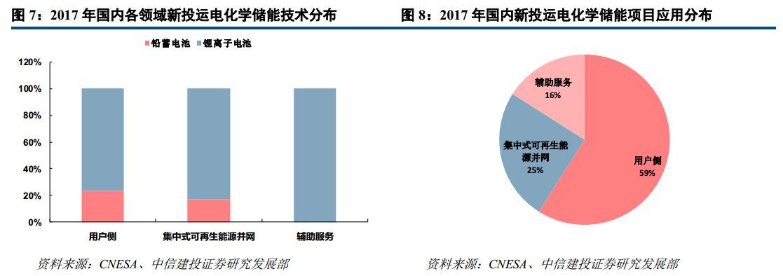 具體到儲(chǔ)能各應(yīng)用場(chǎng)景分布, 2017 年國(guó)內(nèi)電化學(xué)儲(chǔ)能項(xiàng)目應(yīng)用集中在用戶側(cè)、集中式可再生能源并網(wǎng)以及輔助服務(wù)領(lǐng)域,占比分別達(dá)到 59%、 25%、 16%。其中,鋰離子電池由于其高能量密度以及高充放電倍率優(yōu)勢(shì),在集中式可再生能源并網(wǎng)和輔助服務(wù)領(lǐng)域應(yīng)用占比分別達(dá)到 83%、 100%, 而鉛蓄電池由于其成本優(yōu)勢(shì), 在用戶側(cè)領(lǐng)域應(yīng)用占比達(dá)到 77%。