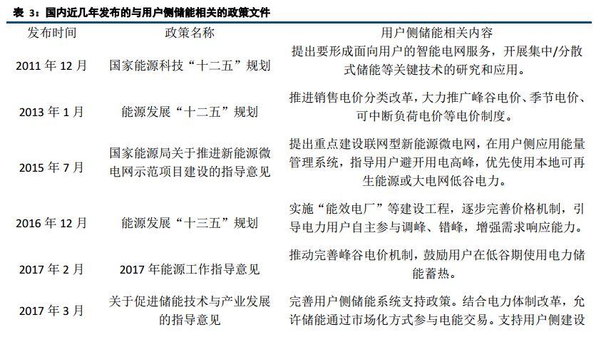 國(guó)內(nèi)利好政策頻出,用戶側(cè)儲(chǔ)能受到大力支持。 自 2011 年《國(guó)家能源科技“十二五”規(guī)劃》出臺(tái),其中明確提出要建成面向用戶的智能電網(wǎng)服務(wù),并開展集中/分散式儲(chǔ)能等關(guān)鍵技術(shù)的研究和應(yīng)用,此后不斷有政策出臺(tái),對(duì)于推動(dòng)用戶側(cè)儲(chǔ)能發(fā)展具有重要的意義。整體上,用戶側(cè)儲(chǔ)能屬于儲(chǔ)能的一個(gè)細(xì)分領(lǐng)域,尚未有專門的單獨(dú)對(duì)該行業(yè)進(jìn)行指導(dǎo)的政策性文件; 但是在一些重要的發(fā)展規(guī)劃或指導(dǎo)意見中都對(duì)其表達(dá)了的支持。相關(guān)政策主要分為兩類,一是在電改工程里,堅(jiān)定推廣完善峰谷電價(jià)、季節(jié)電價(jià)等價(jià)格機(jī)制;二是放開用戶側(cè)市場(chǎng),鼓勵(lì)用戶自主參與儲(chǔ)能調(diào)峰。