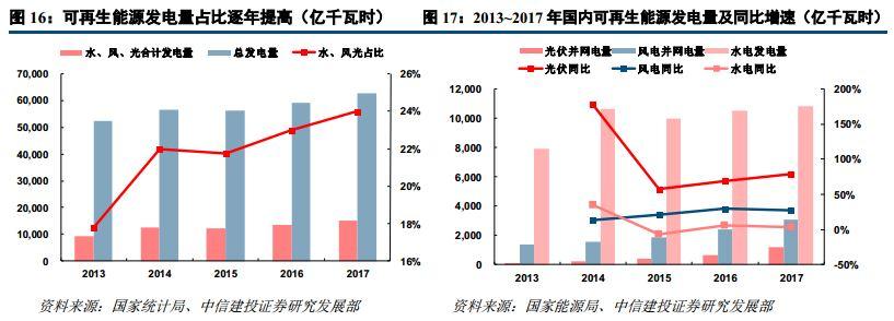 風(fēng)、光發(fā)電總量及占比不斷提高。 截止 2017 年底我國(guó)可再生能源發(fā)電裝機(jī)總量達(dá)到 6.5 億千瓦,其中,水電裝機(jī) 3.41 億千瓦,風(fēng)電裝機(jī) 1.64 億千瓦,光伏發(fā)電裝機(jī) 1.3 億千瓦,可再生能源發(fā)電裝機(jī)約占全部電力裝機(jī)的36.6%。同時(shí),可再生能源發(fā)電量在總發(fā)電量占比逐年提高, 2017 年可再生能源發(fā)電量達(dá) 1.7 萬億千瓦時(shí),占全部發(fā)電量的 26.4%。從可再生能源發(fā)電結(jié)構(gòu)上看,水電已經(jīng)進(jìn)入低速增長(zhǎng)期,風(fēng)、光電仍維持高增速。