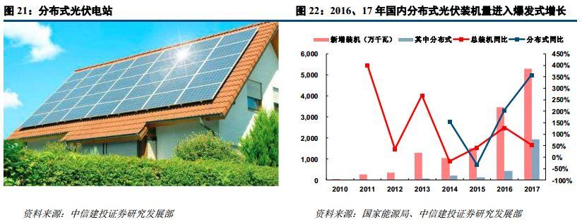 分布式光伏發(fā)電迎來發(fā)展新契機(jī)。 分布式光伏發(fā)電具有靠近用戶側(cè)、建設(shè)規(guī)模靈活、安裝簡(jiǎn)單、適用范圍廣的特點(diǎn),是光伏發(fā)電重要的應(yīng)用形式,此前分布式光伏發(fā)電由于投資成本高、風(fēng)險(xiǎn)大、商業(yè)模式不成熟、金融機(jī)構(gòu)參與意愿低等原因,發(fā)展相對(duì)緩慢。自 2016 年起,隨著燃煤發(fā)電上網(wǎng)價(jià)格下調(diào)、光伏發(fā)電標(biāo)桿電價(jià)下調(diào),政策逐步向分布式光伏發(fā)電傾斜,分布式光伏電站迎來春天。 2016、 2017 年分布式光伏發(fā)電連續(xù)兩年呈現(xiàn)爆發(fā)式增長(zhǎng),其中 2017 年全年新增裝機(jī) 1944 萬千瓦,同比增加 358%。