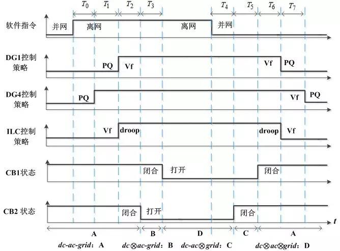 本文以主從控制結構為例進行切換控制邏輯的設計。主要包括兩方面內容:一是交直流混合微電網(wǎng)中平衡節(jié)點轉移時序設計;二是不同控制策略之間進行切換時控制算法補償策略設計。