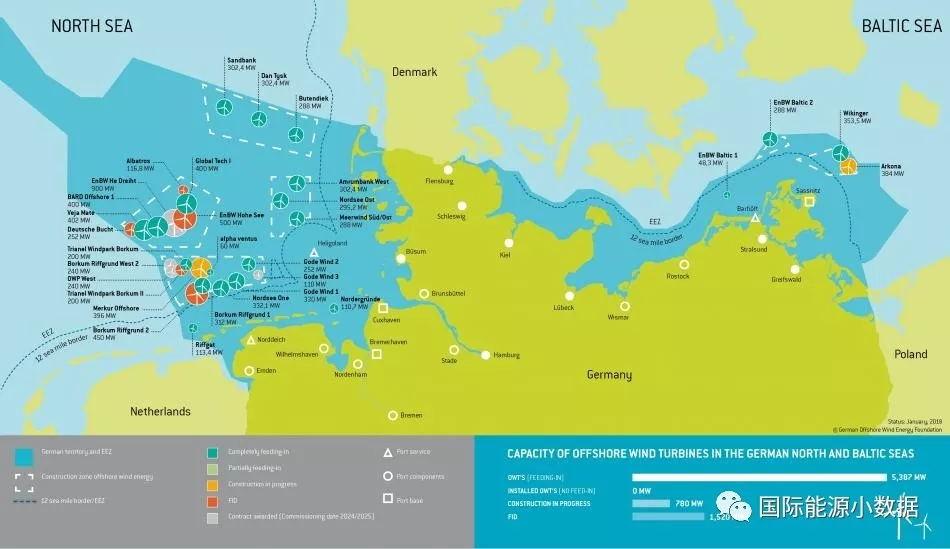 中國儲能網(wǎng)訊:2017年德國新吊裝了222臺海上風力發(fā)電機,新增裝機容量1.25吉瓦,比上一年增長30%,占全球海上風電增量的40%。到2017年末,德國海上風機共有1169座(997座在北海,172座在波羅的海),總裝機容量5.38吉瓦,2017年發(fā)電量179億千瓦時,占全國發(fā)電量的2.7%,就業(yè)崗位約20000人。按照德國政府的目標,2020年德國海上風電裝機將達到7.7吉瓦,2030年達到15吉瓦。2017年海上風機的平均單機容量為6兆瓦,預計2025年增至13-15兆瓦。