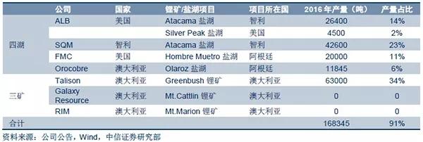 全球鋰資源供應(yīng)高度集中于“四湖三礦”。中信證券的研報(bào)顯示,2016年,全球鋰礦產(chǎn)量折合碳酸鋰當(dāng)量18.4萬(wàn)噸,其中Talison、SQM、美國(guó)雅寶(ALB)、美國(guó)FMC以及澳大利亞Orocobre五家公司產(chǎn)量占比達(dá)91%,行業(yè)集中度高,資源壟斷格局明顯。
