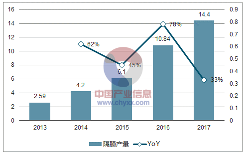 2013-2017年國內(nèi)隔膜產(chǎn)量(單位:億平方米)