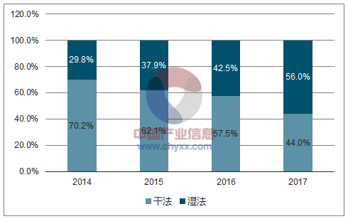 2013-2017年干法隔膜和濕法隔膜產(chǎn)量占比