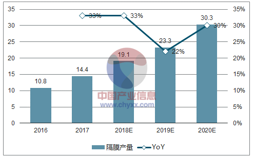 2018-2020年隔膜產(chǎn)量預(yù)測(單位:億平方米)