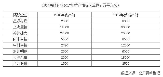在動力電池行業(yè)高景氣的預(yù)期下,各大隔膜企業(yè)紛紛投資擴產(chǎn)濕法隔膜。2016年,國內(nèi)濕法隔膜企業(yè)產(chǎn)能約為8.6億平方米;2017年,我國新增濕法隔膜名義產(chǎn)能超過14.7億平方米。其中,上海恩捷、蘇州捷力、中材科技和天津東皋的新投資產(chǎn)能均超過1億平方米。產(chǎn)能的快速擴張將有利于企業(yè)進一步搶占市場份額,同時規(guī)?;a(chǎn)也將降低企業(yè)的生產(chǎn)成本;但是,行業(yè)內(nèi)的低端產(chǎn)能過剩狀況也將進一步加劇。