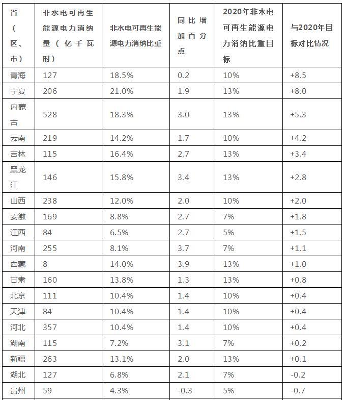 青海。2017年,全部可再生能源電力消納量為446億千瓦時,占本省全社會用電量的比重為64.9%,同比上升2.5個百分點;非水電可再生能源電力消納量為127億千瓦時,占本省全社會用電量的比重約為18.5%,同比上升0.2個百分點。