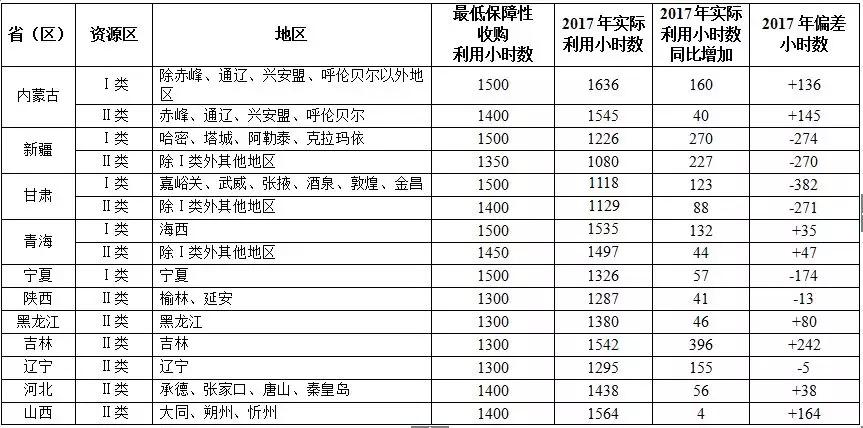 2017年,全部規(guī)定風電最低保障收購年利用小時數(shù)的地區(qū)的風電實際發(fā)電小時數(shù)較2016年均增加,但新疆Ⅲ類資源區(qū)、甘肅、寧夏、吉林Ⅲ類資源區(qū)未達到風電最低保障收購年利用小時數(shù)要求。其中,甘肅Ⅱ類和Ⅲ類資源區(qū)實際利用小時數(shù)與最低保障收購年利用小時數(shù)偏差分別為-305小時和-383小時;寧夏由于來風情況偏差,偏差為-200小時;新疆Ⅲ類資源區(qū)和吉林Ⅲ類資源區(qū)偏差分別為-116小時和-112小時。其他地區(qū)達到風電最低保障收購年利用小時數(shù)要求。
