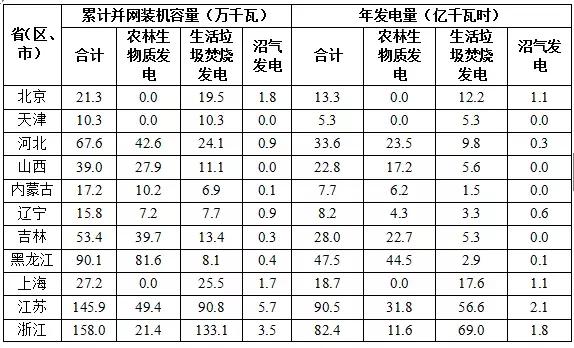 截至2017年底,全國共有30個省(區(qū)、市)投產(chǎn)了747個生物質發(fā)電項目,并網(wǎng)裝機容量1476.2萬千瓦(不含自備電廠),年發(fā)電量794.5億千瓦時。其中農(nóng)林生物質發(fā)電項目271個,累計并網(wǎng)裝機700.9萬千瓦,年發(fā)電量397.3億千瓦時;生活垃圾焚燒發(fā)電項目339個,累計并網(wǎng)裝機725.3萬千瓦,年發(fā)電量375.2億千瓦時;沼氣發(fā)電項目137個,累計并網(wǎng)裝機50.0萬千瓦,年發(fā)電量22.0億千瓦時。生物質發(fā)電累計并網(wǎng)裝機排名前四位的省份是山東、浙江、江蘇和安徽,分別為210.7萬、158.0萬、145.9萬和116.3萬千瓦;年發(fā)電量排名前四位的省份是山東、江蘇、浙江和安徽,分別是106.5億、90.5億、82.4億和66.2億千瓦時。2017年各?。▍^(qū)、市)各類生物質發(fā)電并網(wǎng)裝機及發(fā)電量如下: