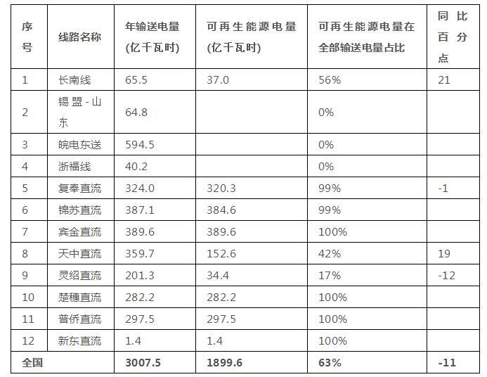 12條特高壓線路輸送電量3008億千瓦時,其中輸送可再生能源電量1900億千瓦時,同比上升10%,占全部輸送電量的63%,同比下降11個百分點。