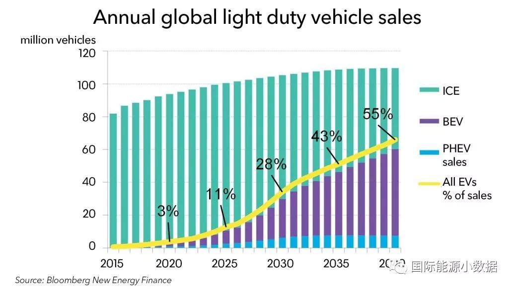 中國儲能網(wǎng)訊:2017年全球銷售110萬輛輕型電動汽車,到2025、2030、2040年銷售量能達到多少呢?根據(jù)彭博新能源財經(jīng)(BNEF)發(fā)布的最新預測,2025年全球輕型電動汽車的銷量可達1100萬輛(占當年汽車市場銷售量的11%)。2030年起鋰電池組價格將降至70美元/千瓦時,電動汽車可望在沒有補貼的情況下與燃油汽車競爭,2030年全球輕型電動汽車銷量可達3000萬輛(市場份額28%)。