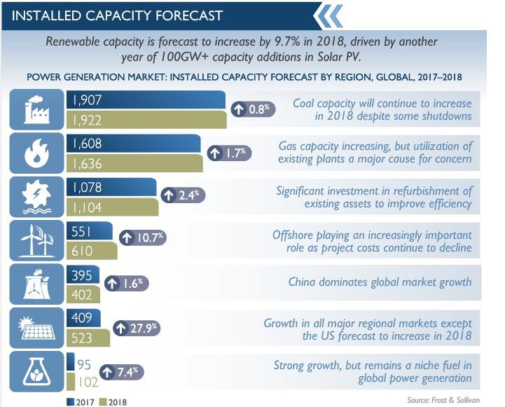 與2017年類似,F(xiàn)rost&Sullivan預(yù)計(jì)太陽能占投資的大部分,預(yù)計(jì)2018年為1230.3億美元,中國將成為主要投資方。太陽能和風(fēng)能(海上)的需求和投資環(huán)境呈現(xiàn)出積極的態(tài)勢。