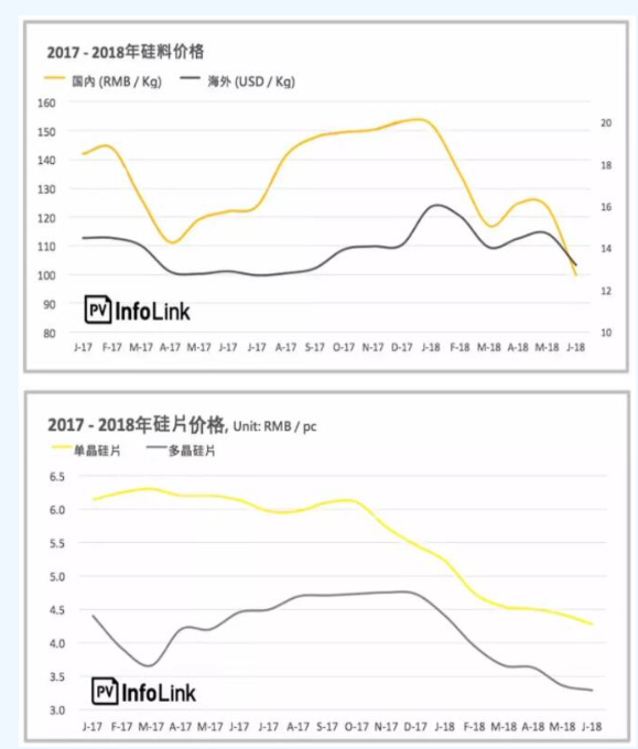 從上面三張圖可以看出,硅料的價(jià)格較為不穩(wěn)定,但硅片的價(jià)格在過(guò)去半年呈下降趨勢(shì)。因?yàn)楣杵前疵科瑑r(jià)格計(jì)算的,所以隨著電池技術(shù)的提升,最終反映到組件價(jià)格上下降趨勢(shì)更明顯。所以從2016-2018組件價(jià)格走勢(shì)圖上,可以看到組件從2017年底到近期的下降趨勢(shì)并沒(méi)有單晶硅片那么明顯,但仍比多晶硅片降價(jià)幅度大。組件價(jià)格近期不是直線下降,一部分原因是受17年1231和18年630仍存在的小規(guī)模搶裝影響。