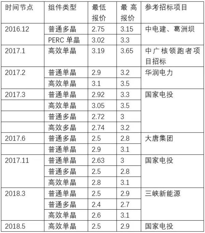 我們統(tǒng)計(jì)了從2016年底到2018年5月份多個(gè)組件招標(biāo)的報(bào)價(jià):