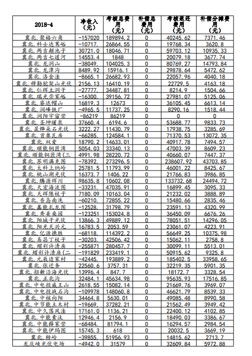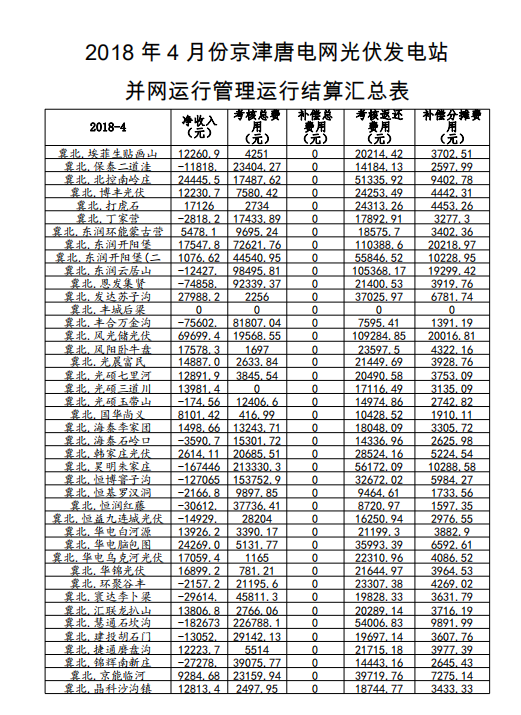 2018年4月份京津唐電網(wǎng)光伏發(fā)電站并網(wǎng)運行管理運行結(jié)算匯總表如下: