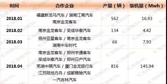那么,是什么讓億緯鋰能的動(dòng)力電池裝機(jī)量在4月發(fā)生華麗反轉(zhuǎn)?經(jīng)研究我們發(fā)現(xiàn),億緯鋰能的增長(zhǎng)源于合作企業(yè)的增多和配套南京金龍客車的數(shù)量上升,尤其是配套南京金龍客車數(shù)量的急劇上升。4月合作的企業(yè)由年初的3家企業(yè)增長(zhǎng)到9家企業(yè),配套車輛由年初的562臺(tái)增長(zhǎng)到4月的816臺(tái),裝機(jī)電量由16.93Mwh增長(zhǎng)到了145.94Mwh;4月配套南京金龍客車611臺(tái),裝機(jī)電量為124.76Mwh。同時(shí)從下圖我們不難發(fā)現(xiàn),億緯鋰能在4月進(jìn)入了宇通客車電池配套體系。一向由寧德時(shí)代供貨為主的宇通客車,在4月10.27%的動(dòng)力電池裝機(jī)量由億緯鋰能提供。