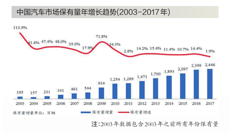 從2017年底的中國汽車市場保有量增長趨勢來看,2009年新購的汽車仍有934萬輛活躍于市場,而之后每年增長均在千萬輛以上,2015年之后更是超過了2000萬輛。