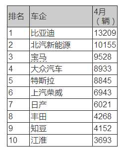 北汽EC系列成為當月最暢銷車型排行冠軍,銷量為7471輛,同比增加72%。排在第二的是日產(chǎn)聆風(Leaf),較3月份的創(chuàng)紀錄水平下降了47%,但是5941輛的銷量成績?nèi)员热ツ晖诖笤?7%。資料來源:EVSALES