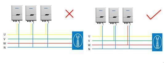 另外,還有一種情況值得一提,就是在多臺(tái)設(shè)備并網(wǎng)時(shí),若集中并到一相上,則容易抬高該相電壓(類似多條河流匯到一個(gè)窄河床上,造成水溢),使電網(wǎng)偏壓,從而造成類似電網(wǎng)電壓過高的現(xiàn)象。因此,建議同一并網(wǎng)點(diǎn)多臺(tái)并網(wǎng)時(shí),應(yīng)盡量使設(shè)備在三相上均勻分布 (如下圖)。
