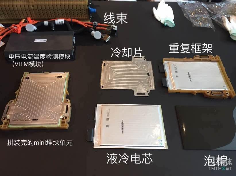 百余個電芯分為兩組,每組52片。每兩片電芯組成一個 mini 堆垛單元,并通過流水線焊接在一起形成一組模塊。電芯與電芯之間由鋁制冷卻片隔開,冷卻液通過注水口注入,填充冷卻片上的“毛細(xì)管”,循環(huán)流動,控制整個電池包的熱量,使整車工作溫度范圍寬達-30度至55攝氏度。兩組模塊由線束接入電壓電流溫度檢測模塊(VITM模塊),也就是上述視頻中的“黑匣子”——這一模塊也就是整個動力電池包的“大腦”。