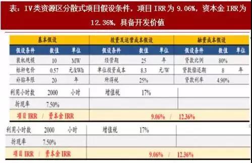 表:IV類資源區(qū)分散式項(xiàng)目假設(shè)條件,項(xiàng)目IRR為9.06%,資本金IRR為12.36%,具備開(kāi)發(fā)價(jià)值