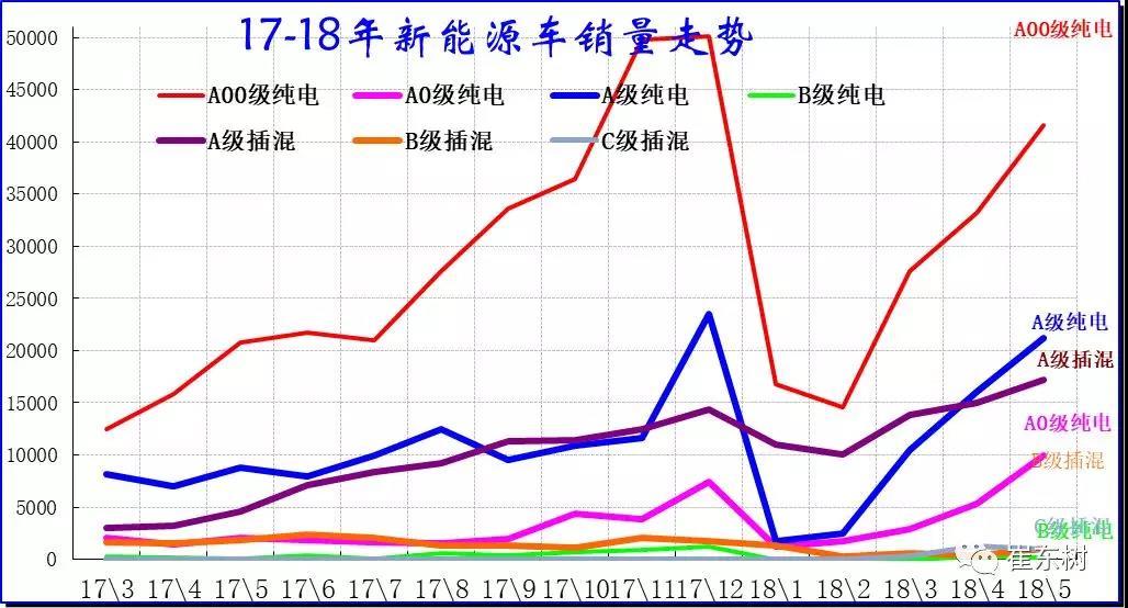 而18年A級(jí)電動(dòng)車表現(xiàn)也較強(qiáng),雖然17年9月調(diào)整,但12月仍較增長(zhǎng)。18年1-2月的A級(jí)電動(dòng)車偏弱,3-5月增長(zhǎng)較好。A0級(jí)也是在4-5月高增長(zhǎng)。
