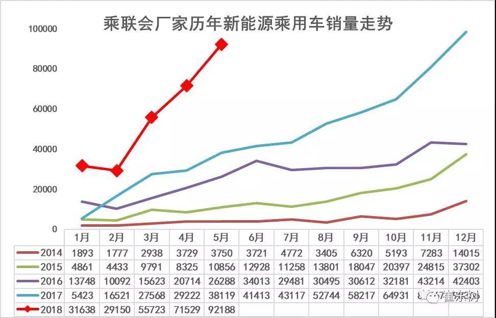 在總體中國(guó)乘用車市場(chǎng)走勢(shì)年初高、隨后持續(xù)下行到夏季谷底的正常走勢(shì)下,新能源乘用車呈現(xiàn)頑強(qiáng)的月度環(huán)比向上趨勢(shì)。2018年新能源乘用車市場(chǎng)走勢(shì)呈現(xiàn)開(kāi)門(mén)紅的特征,1月份的新能源乘用車,銷量達(dá)到31638臺(tái),同比增長(zhǎng)483%。因?yàn)榇汗?jié)因素,今年2月2.9萬(wàn)臺(tái)的規(guī)模,應(yīng)該說(shuō)是表現(xiàn)良好的。3月政策明朗后的銷量暴增到5.57萬(wàn)臺(tái),4月進(jìn)一步拉升到7.2萬(wàn)臺(tái),5月拉升到9.2萬(wàn)臺(tái),相對(duì)于17年的5月的平緩走勢(shì),走強(qiáng)力度很猛,體現(xiàn)了新能源乘用車在政策明朗后的階段性發(fā)展動(dòng)力較強(qiáng)。