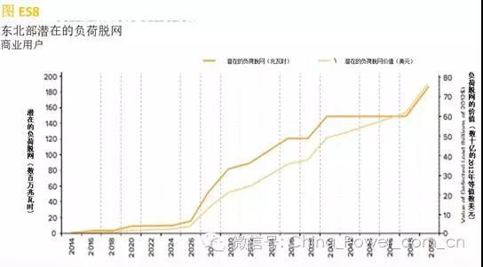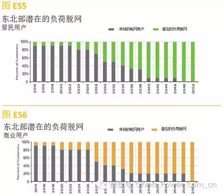 2010年至2030年間,電網(wǎng)將需要金額高達(dá)2萬億美元的投資,或者說每年投資金額達(dá)1000億美元 。 目前,這些投資將通過銷售電量獲得的收入收回。如果支持該投資的銷售電量收入中的一小部分流失掉的話,系統(tǒng)的經(jīng)濟(jì)效益都會受到很大的影響 。值得注意的是,我們的分析顯示,聯(lián)網(wǎng)的太陽能發(fā)電+電池儲能系統(tǒng)將給大量用戶帶來經(jīng)濟(jì)效益,而且這一系統(tǒng)將會向越來越多的用戶供應(yīng)電力。假設(shè)用戶根據(jù)最佳經(jīng)濟(jì)性而選擇電力供應(yīng)方式,則可能發(fā)生大規(guī)模的用戶負(fù)荷脫網(wǎng)。例如,在美國東北部,到15年之后的2030年,對電量銷售的最大侵蝕可能是: