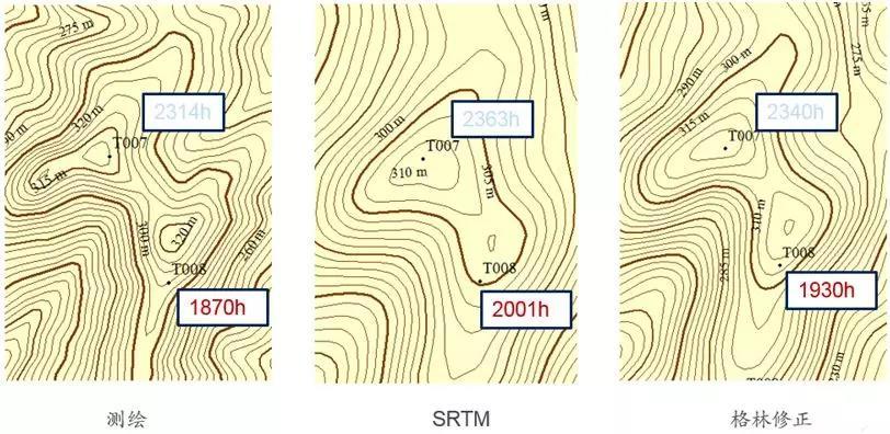 為什么會(huì)這樣呢?通過詳細(xì)甄別,遠(yuǎn)景能源發(fā)現(xiàn)在這些項(xiàng)目中,機(jī)位與測風(fēng)塔處的測繪圖地形特征與衛(wèi)星地圖地形特征存在顯著的差異。在下面的例子里,一個(gè)普通的小山包,在衛(wèi)星地圖上就是一條等高線,而在測繪圖中它卻顯得十分陡峭,擋住了1/4的扇區(qū)。