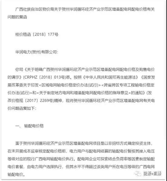 下圖是廣西自治區(qū)物價(jià)局針對賀州華潤循環(huán)經(jīng)濟(jì)產(chǎn)業(yè)示范園區(qū)增量配電網(wǎng)配電價(jià)格核定的一個(gè)函。其中提到:“配電企業(yè)可探索結(jié)合負(fù)荷率等因素制定輸配電價(jià)套餐,由電力用戶選擇執(zhí)行,但其水平不得超過該類用戶所在電壓等級的廣西電網(wǎng)收費(fèi)電價(jià)”。