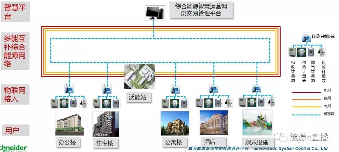 以泛能站為核心,打通不同能源之間的豎井,實(shí)現(xiàn)多能互補(bǔ)、三網(wǎng)融合;用戶終端采用“四表合一” 的物聯(lián)網(wǎng)接入方式,實(shí)現(xiàn)數(shù)據(jù)統(tǒng)一采集、上傳。