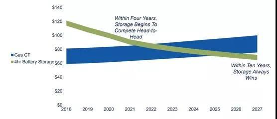 未來(lái)十年美國(guó)需要為電網(wǎng)新增20GW的調(diào)峰能力,其中半數(shù)以上的電量會(huì)在這十年的后期投入使用,如下圖顯示2018-2020年期間為7440MW,2023年至2027年為12645MW。這剛好為儲(chǔ)能提供了時(shí)間以便發(fā)揮其經(jīng)濟(jì)優(yōu)勢(shì)。當(dāng)然如果技術(shù)發(fā)展的更快的話,儲(chǔ)能的經(jīng)濟(jì)優(yōu)勢(shì)會(huì)更快顯現(xiàn)。