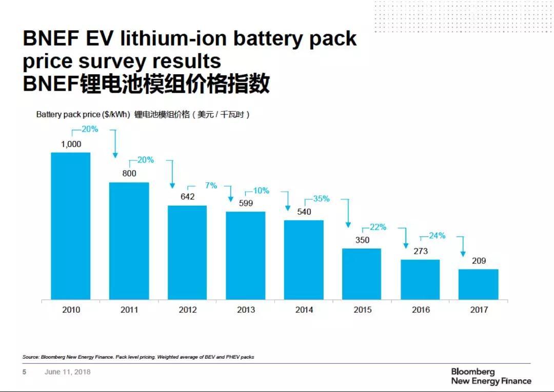 過去三年,鋰電池模組價格保持著20%以上的降幅,2017年為209美元/千瓦時,還不到2014年的四成。McKerracher表示,2025年則將進一步下降到96美元/千瓦時。